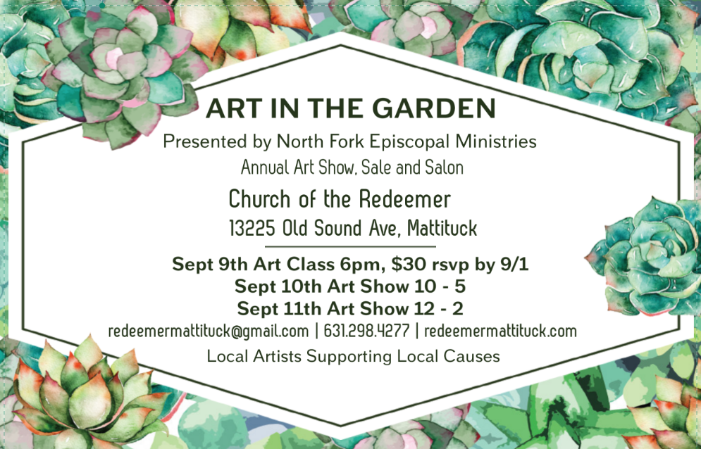 Our Annual Art Show, Sale and Salon happens in September. With the generosity of many local artists this fundraiser generates funds that are donated to local outreach in our community. If you are an artist that would like to be involved contact the church office here for details.